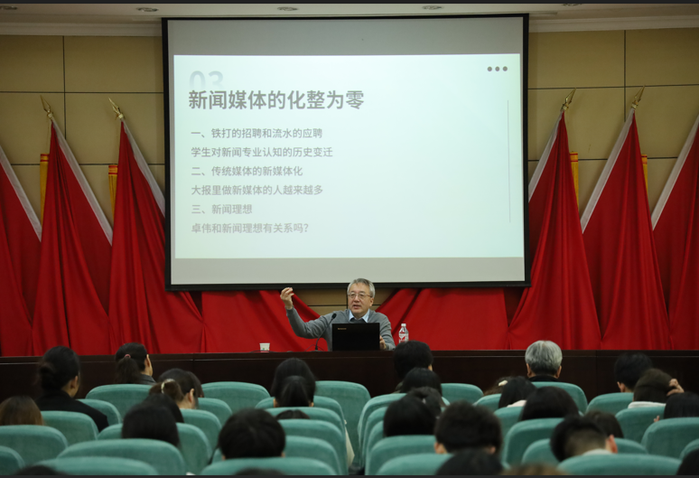 刘宏教授结合丰富的教学实践经验和学术底蕴,从评论性报纸与报道性报纸的显著差异、西方理论与中国实践的适配性、传播学与新闻学的交融互动、传统媒体的新媒体化以及概念化、新闻专业主义的水土不服、网络对报纸与电视媒体的差异化影响等新闻传播学界六大前沿议题为学院师生带来了一场精彩的报告会,向大家揭示了当前媒体环境所面临的一系列重大课题。就当前社会中新媒体行业的新动向新态势,刘宏援引《人民日报》实例指出当前行业生产正在经历由“整”向“零”的变化,为高校人才培养、学生就业提供了新思路、新理念。讲座互动环节气氛热烈,同学们踊跃发言提问,刘宏教授一一进行解答,给出了许多具有前瞻性的宝贵建议。讲座为学院师生带来了知识的盛宴,更激发了大家对新闻传播事业背后责任与使命的深刻思考。