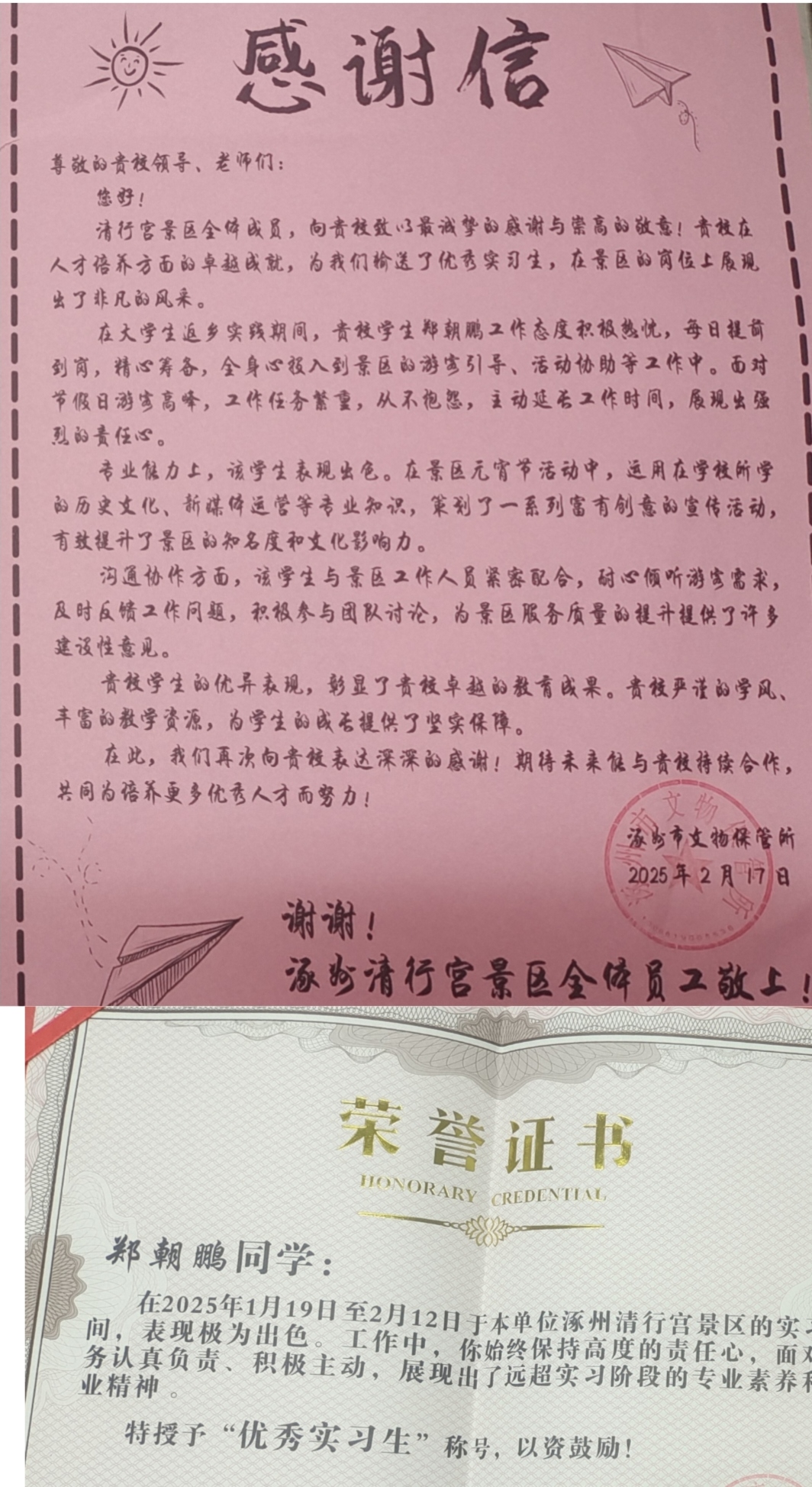 近日,传媒学部收到涿州市文物保管所寄来的感谢信,信中对2022级新闻学专业郑朝鹏同学在实践期间的表现给予了高度评价,对学院为其输送优秀实习生表示诚挚感谢,并授予郑朝鹏“优秀实习生”称号。