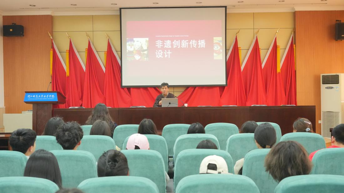 王洪亮教授在图书馆一楼报告厅作题为“非遗全媒体传播设计的3C维度与UFO设计原则”的学术报告。在传统文化创新传播设计、 人工智能艺术与设计领域深耕多年,王教授向在场师生讲解实现“非遗”可持续传播的3C维度理论(文化Culture、传播Communicate、创造Creative),指出“渠道拓宽”与“表达创新”在提升“非遗”可见度、生命力中的重要性。随后,王老师详细阐述了在非遗传播设计“落地”应用中的UFO原则(独特Unique、适合Fit、开放Open),探讨了该原则对“非遗”包容性、辨识性、适配性提供的潜力空间。在现场,王老师向大家分享了自己指导的学生设计作品和课题研究,深入阐释了非遗文化传播设计价值,并就人机协同的未来发展趋势作出预测和展望。