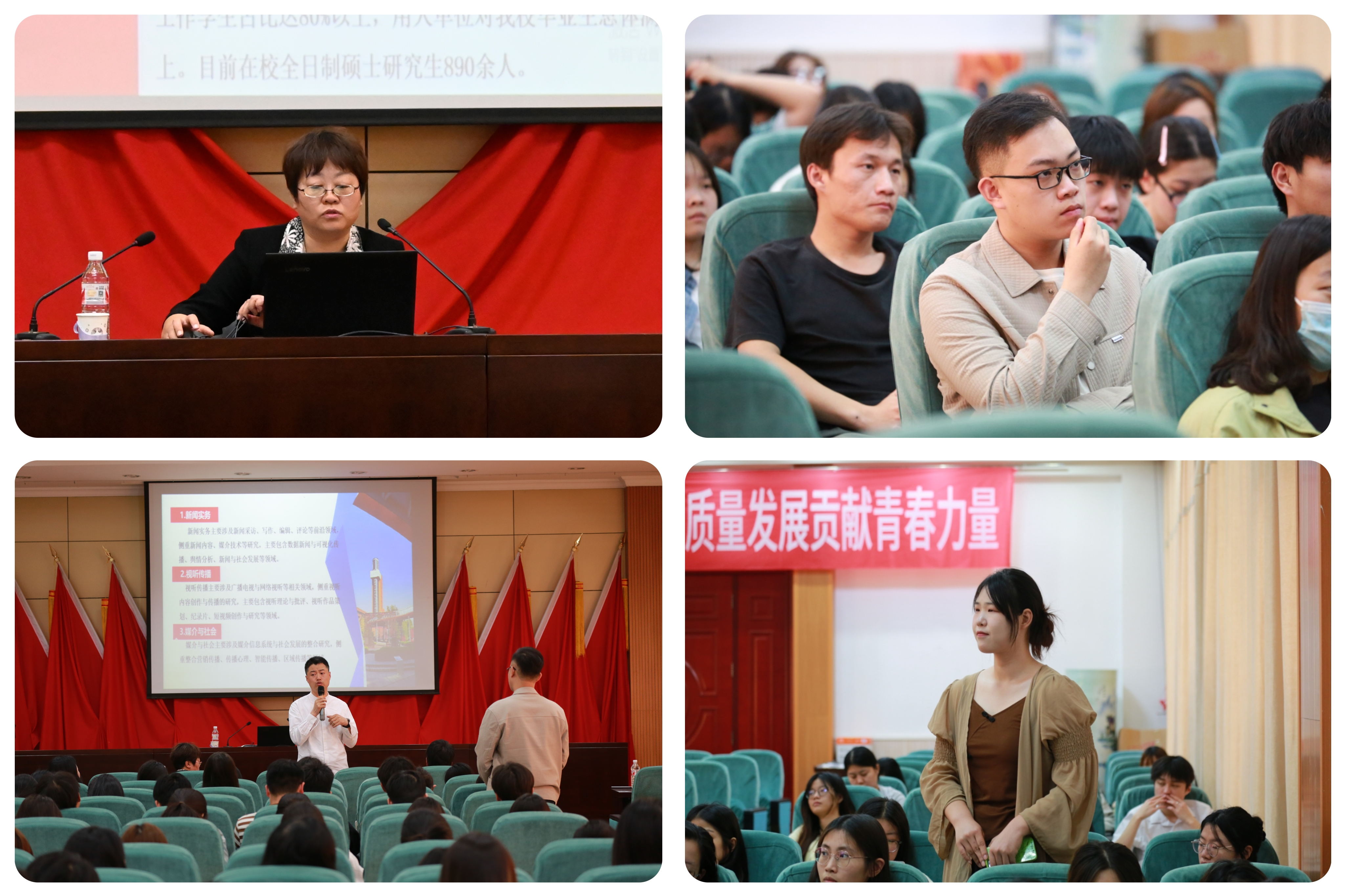 传媒学部部长李占涛主持宣讲会。卢红玲教授详细介绍了河北传媒学院的发展历程、学科优势、师资力量与科研成果,鼓励beat365官网学子报考研究生。新闻传播学院副院长朱良志、影视艺术学院副院长李峰热情回应同学们的提问,就国家考研政策、专业选择、复习方法等关键问题进行了深入解答。