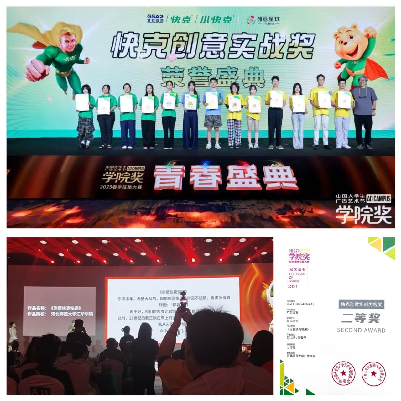7月31日,2025中国大学生广告艺术节学院奖春季赛结果揭晓,由传媒学部2024级广告学专业赵以琳、张馨予同学创作的文案作品《赤壁快克快递》,荣获“快克创意实战内容奖”二等奖 。