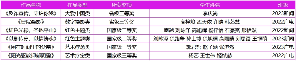 此次大赛中,传媒学部的多件作品脱颖而出,共斩获2项省级三等奖,国家级奖项四项,其中二等奖2项、三等奖2项,涵盖大爱中国类、数字摄影类、红色主题类和艺术疗愈类等多个赛道。