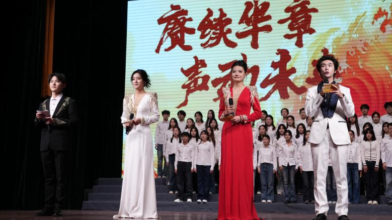 下篇节目以青春与创作为主线,原创情景剧《走!逛汇华》由同学们自编自演,以轻快节奏展现青年逐梦的热情;原创朗诵《传媒新声,逐光征途》由全体同学共同呈现,表达了对传媒事业的向往与担当;演出在合唱《我们的明天》中落下帷幕,同学们用歌声传递对未来的憧憬与专业的执着。