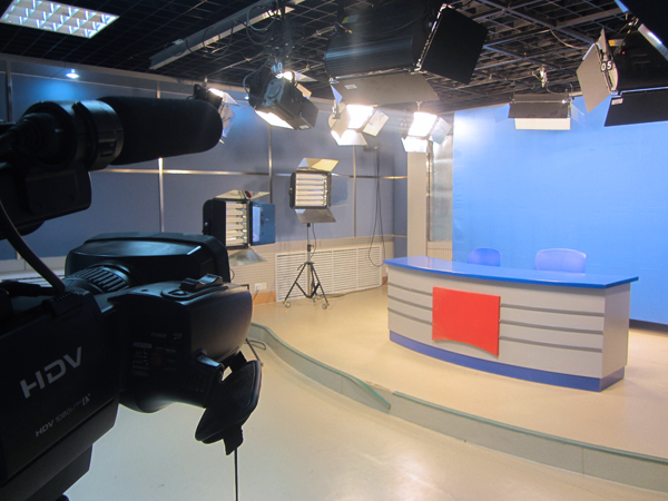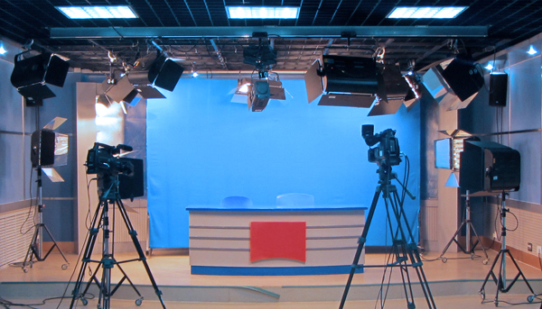 图-2 演播厅内实景,配有专业索尼高清摄像机,整套灯光控制系统和蓝幕背景,用于虚拟演播创作