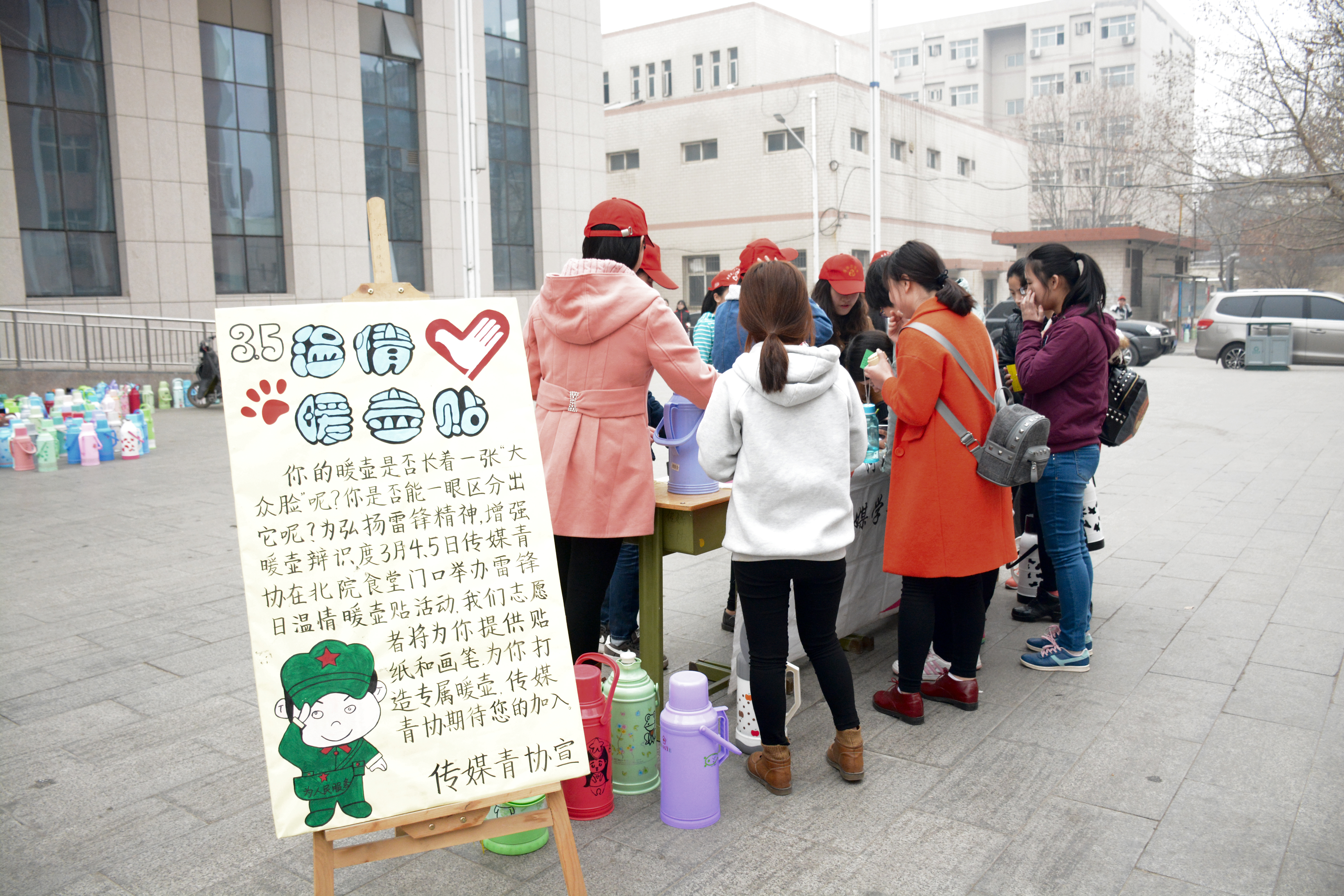 传媒青协志愿者为200多个暖壶顺利完成“换装”。很多参加活动的同学选择了自己喜爱的卡通暖壶贴,或者由志愿者用马克笔将同学们选定的趣味图画,画在暖壶上。志愿者在装扮暖壶过程中的服务热情,感染了在场许多的参与者。