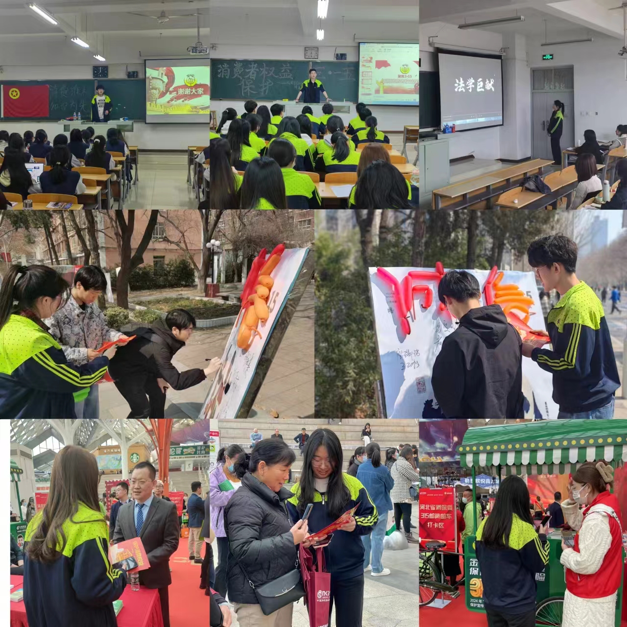 一、校内活动 315前夕,法学社设计相关维权海报在第六教学楼大厅进行张贴,营造了浓厚的宣传氛围。同时,对215名大学生进行消费情况问卷调查,了解大学生群体的在消费中的权益维护情况,据此制作消费者维权宣传单,帮助大家理解维权的途径和方法。随后,举办“3·15”国际消费者权益日知识竞答活动,让同学们了解了更多消费者权益维护的相关知识,提高维权意识。 为宣传消费者权益保护相关内容,法学社制作《国际消费者权益日》PPT并为8各班级约五百人进行法治宣讲,加深了大家对消费者权益保护法的了解和认识。2023级法学专业拍摄《消费无诈》微电影,采取新颖方式激发了同学们对于消费者权益保护法的学习兴趣。 3月15日中午,在食堂西侧,法学专业学生布置活动场地,通过展板、海报和宣传单等多种方式向过往同学们宣传消费者权益保护相关法律知识,介绍司法中的真实侵权案例,普及维权的方法和解决问题的途径,邀请同学们进行“3.15诚信签名”。 二、校外活动: 315当天,法学专业学生代表在石家庄勒泰广场参与了由河北省消费者权益保护协会等单位主办的大型消费者权益保护活动,同学们发放宣传单、接受群众咨询、与法律专业人士进行交流,号召广大群众自觉抵制假冒伪劣产品,维护自身合法权益。 此次活动通过观影、宣讲和互动等环节,进一步提高了同学们对消费者权益知识的了解,有助于同学们在消费过程中识别和防范风险,有效地维护自己的合法权益。