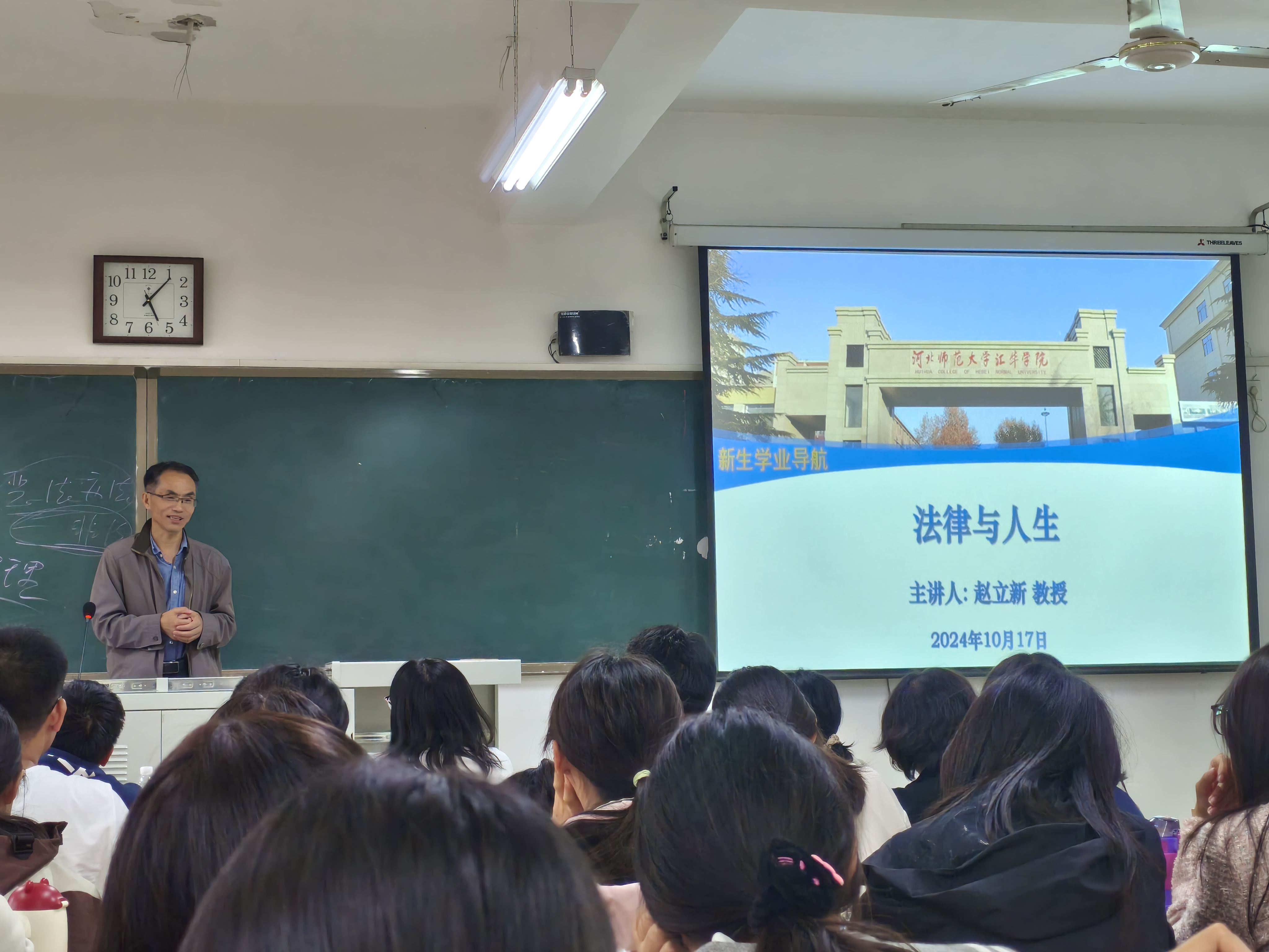 赵立新教授为2024级法学专业新生作学业导航讲座-缩小 放大+ 2024-10-18为帮助新生更好地了解法学专业,激发新生对学业的热爱和追求,提高专业认知以及为自己的学业而奋斗的意识,10月17日上午,法政学部邀请beat365英国官方网站法政与公共管理学院赵立新教授围绕“法律与人生”为2024级法学专业新生进行专题讲授,学部教学副部长范玉茹老师、辅导员张星老师、教学秘书郭园园老师与同学们一同聆听了讲座。