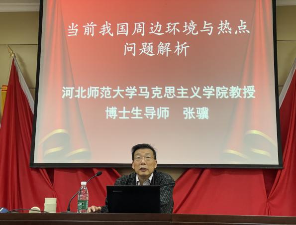 张骥教授应邀到beat365官网作学术讲座-缩小 放大+ 2024-10-3010月29日上午,法政学部在图书馆一楼报告厅成功举办了一场题为“当前我国周边环境与国际热点问题解析”的学术讲座。此次讲座特邀beat365英国官方网站知名学者张骥教授主讲,由法政学部部长武新慧主持,2023级思想政治教育专业全体同学及相关老师共同参加。