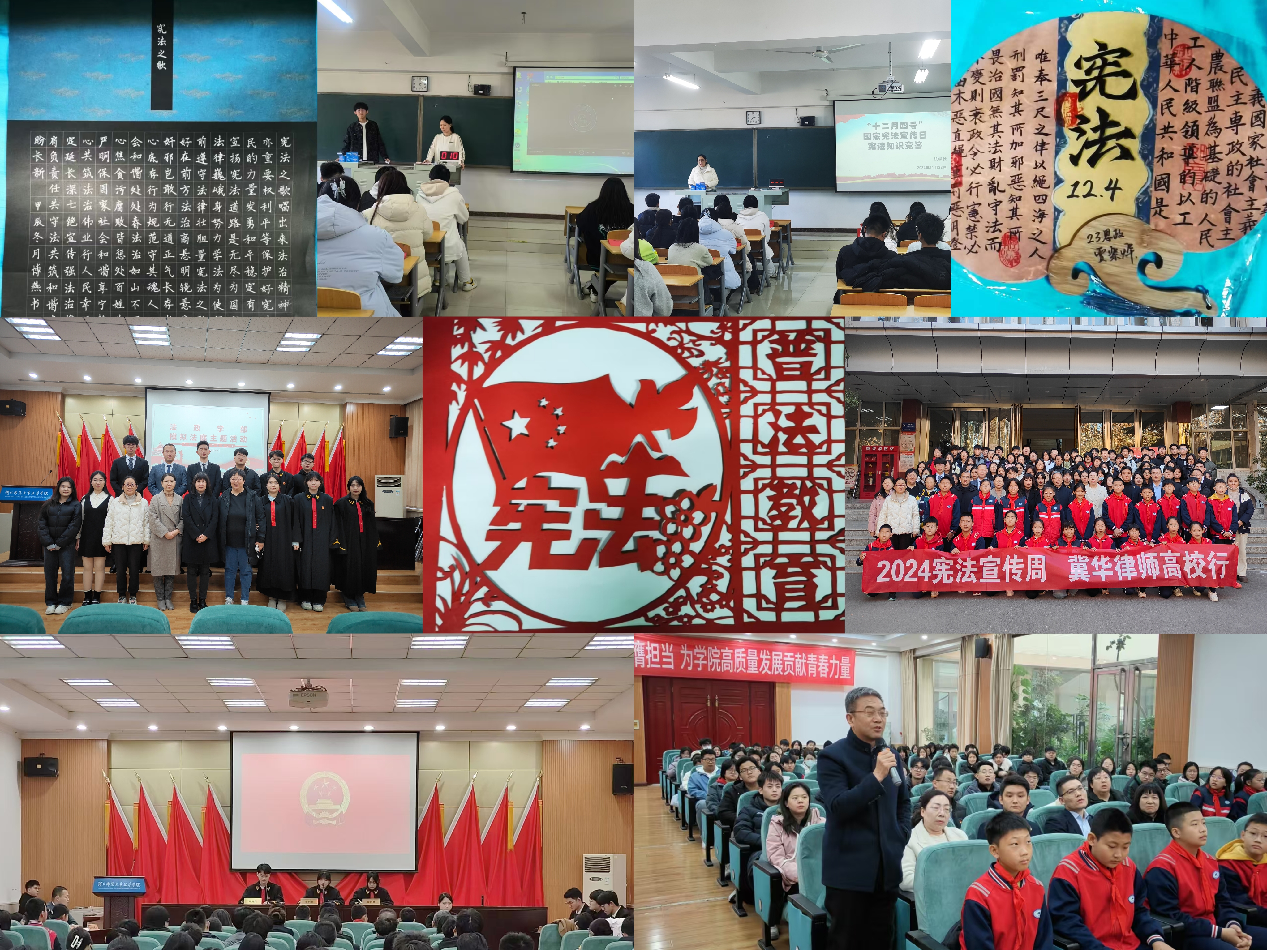 法政学部开展12·4国家宪法日系列活动-缩小 放大+ 2024-12-05今年12月4日是第十一个国家宪法日。法政学部以法学社为载体,以“大力弘扬宪法精神,推动进一步全面深化改革”为主题,开展形式多样的宪法宣传学习活动。本次活动通过模拟法庭、宪法主题书画作品比赛、宪法知识竞答和观看法治人物专题节目等多种形式,吸引了广大师生的积极参与。