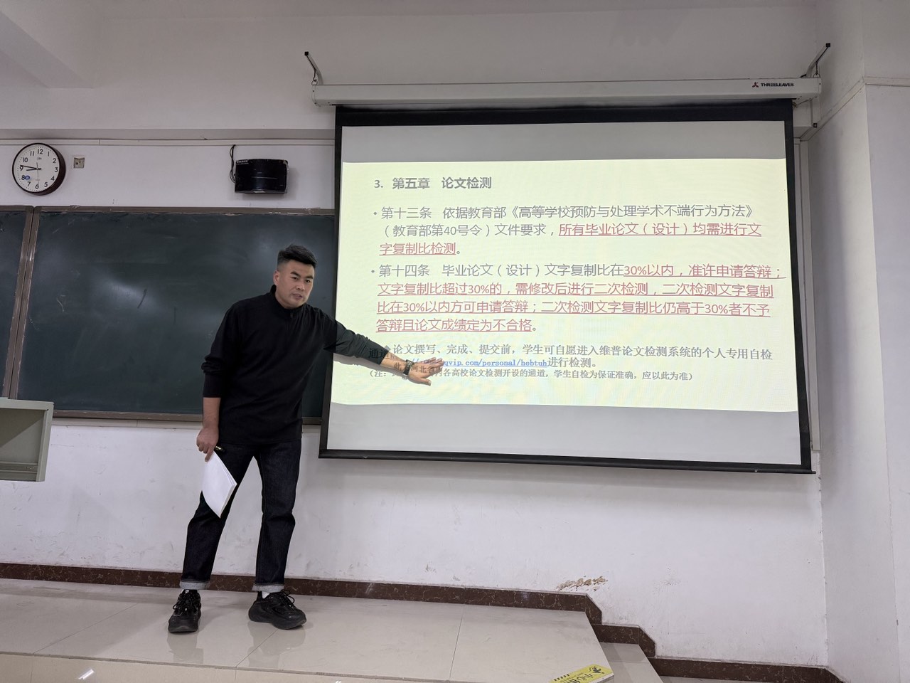 法政学部举办“本科毕业论文相关要求与解读”专题讲座-缩小 放大+ 2024-12-1812月12日下午,法政学部在第六教学楼303教室成功举办了“本科毕业论文相关要求与解读”的专题讲座。本次讲座邀请学院教务处韩金森老师主讲,2025届毕业生到场聆听,学部副部长范玉茹主持。
