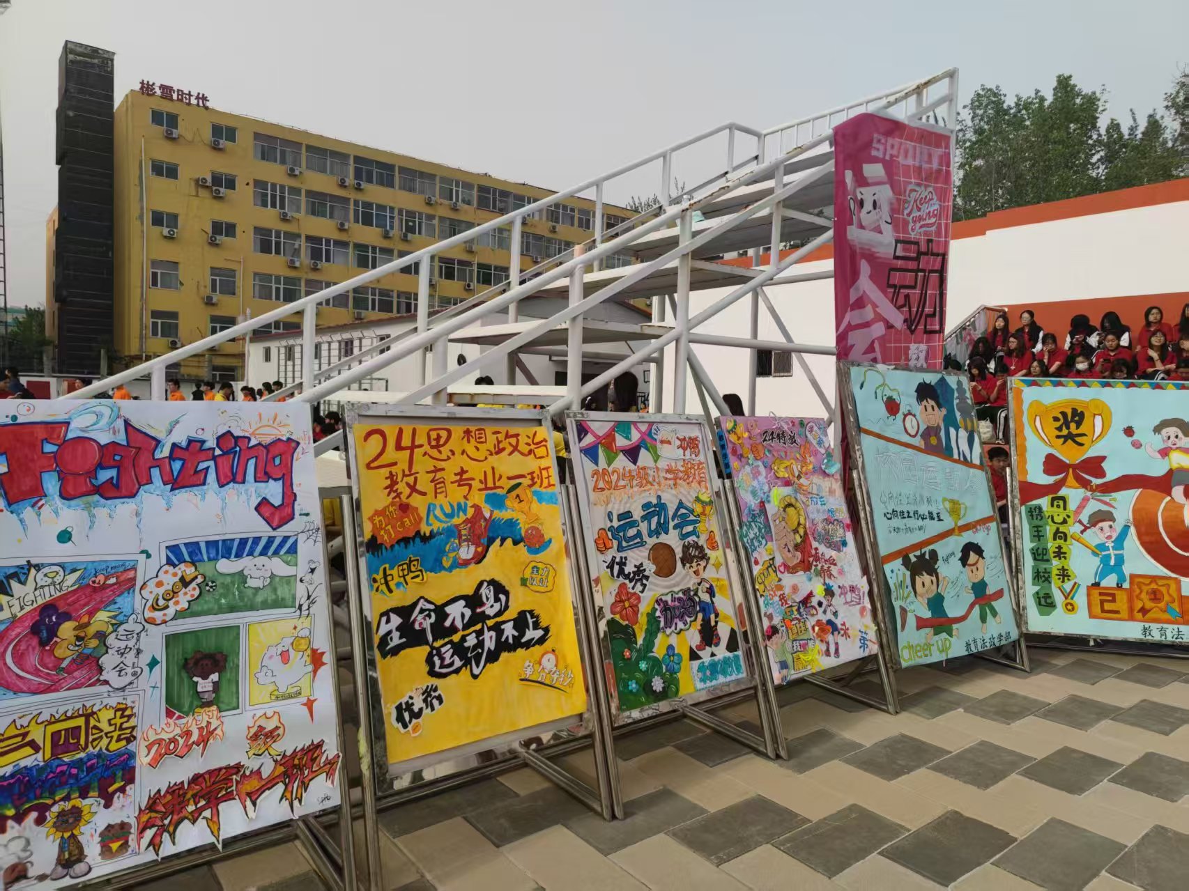 教育法政学部运动会纪实-缩小 放大+ 2025-04-23一、前期筹备:缜密规划,厚积薄发 (一)宣传动员:创意领航,特色风采耀赛场 2024级各班及青年志愿者协会紧密围绕运动会主题,深度融合学科特色与艺术设计理念,精心打造一系列创意展牌,全方位展现青春风采。2024级思想政治教育专业1班以线条勾勒拼搏精神,积极倡导“赛场争先、生活锻炼”的理念,通过视觉艺术传递积极向上的价值观;2024级特殊教育专业1班运用手工立体装饰与“永不言弃”的醒目标语,传递坚韧不拔的力量,体现特殊教育专业对学生意志品质培养的重视;2024级法学专业1班以火焰纹样、萌趣动物等元素烘托热血氛围,展现法学专业学生激情与活力的一面;2024级小学教育专业1班凭借充满童趣的展板,在展现创意的同时,同步锻炼学生的美术与实践能力,契合小学教育专业注重学生综合素质培养的目标。青协发布的“心向往之行必能至”“同心向未来”两幅海报,以及创意公式“10%天份 + 90%努力 = No.1”,以直观生动的方式诠释奋斗的真谛,激发师生的拼搏热情。 (二)后勤保障:细节致胜,坚实后盾护征程 学部领导老师在运动会筹备阶段,专门组织召开学生会筹备协调会,为学生会各部门科学合理地分配任务,并亲自带领同学们进行场地布置工作。观众席按照班级进行分区定位,形成整齐划一的助威方阵。检录处设立“能量补给站”,分类备足了矿泉水、功能饮料、士力架以及急救物品等物资,确保能够精准满足运动员的需求。后勤团队以细致入微的服务,为运动员们构筑坚实的后盾,助力他们在赛场上尽情释放激情,为运动会的顺利开展提供有力保障。 (三)运动员备战:汗水铸就,实力积淀待腾飞 清晨七点的操场,已然成为教育法政学部运动员们的“第二课堂”。短跑选手们反复打磨起跑姿势,通过科学的训练方法,力求在起跑瞬间占据优势,缩短反应时间,提高起跑速度;长跑队员们逐圈突破耐力阈值,通过有氧训练、间歇训练等多种方式,挑战自我极限,提升耐力水平;投掷健儿们通过力量训练,不断雕刻肌肉记忆,提升投掷技巧,增强力量与技术的结合。汗水浸透他们的衣衫,但心中的信念却愈发坚定,为在赛场上取得优异成绩奠定坚实基础。 (四)开场舞与方队:精雕细琢,团结协作展英姿 学部老师全程跟进开场舞与方队的训练工作,从狮头的摆幅角度到鼓点的节奏密度,都进行逐帧打磨。为了呈现出最佳效果,学生团队延长训练时长,将狮舞的雄浑气势、鼓阵的铿锵节奏、舞蹈的灵动姿态与太极的绵长韵味熔铸为一体,打造出极为震撼的视觉效果。方阵旗手校准步伐,队员们手持狮帽反复操练,确保队形变换如齿轮咬合般严丝合缝,展现出高度的团队协作精神和严谨的纪律作风。