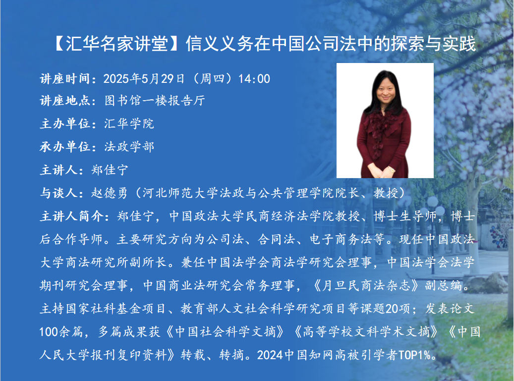 【汇华名家讲堂】信义义务在中国公司法中的探索与实践-缩小 放大+ 2025-05-26讲座题目:信义义务在中国公司法中的探索与实践 讲座时间:2025年5月29日(周四)14:00 讲座地点:图书馆一楼报告厅 主办单位:beat365英国官方网站 承办单位:法政学部 主 讲 人:郑佳宁 与 谈 人:赵德勇 (beat365英国官方网站法政与公共管理学院院长、教授) 主讲人简介:郑佳宁,中国政法大学民商经济法学院教授、博士生导师,博士后合作导师。主要研究方向为公司法、合同法、电子商务法等。现任中国政法大学商法研究所副所长。兼任中国法学会商法学研究会理事,中国法学会法学期刊研究会理事,中国商业法研究会常务理事,《月旦民商法杂志》副总编。主持国家社科基金项目、教育部人文社会科学研究项目等国家级、省部级课题项目20项;发表中文(CSSCI,CLSCI)、英文(SSCI)、法文学术论文100余篇,多篇成果获《中国社会科学文摘》《高等学校文科学术文摘》《中国人民大学报刊复印资料》转载、转摘。2024中国知网高被引学者TOP1%。 内容简介:本次讲座聚焦信义义务在中国公司法的理论与实践,系统梳理了信义义务的理论源流与价值内核,结合《中华人民共和国公司法》的相关规定,对我国公司中董事、监事、高管的信义义务制度与实践应用逐一解读,重点探讨《中华人民共和国公司法》的制度突破,并在对信义义务的法律性质进行分析后,提出对于我国《中华人民共和国公司法》信义义务的改进建议。
