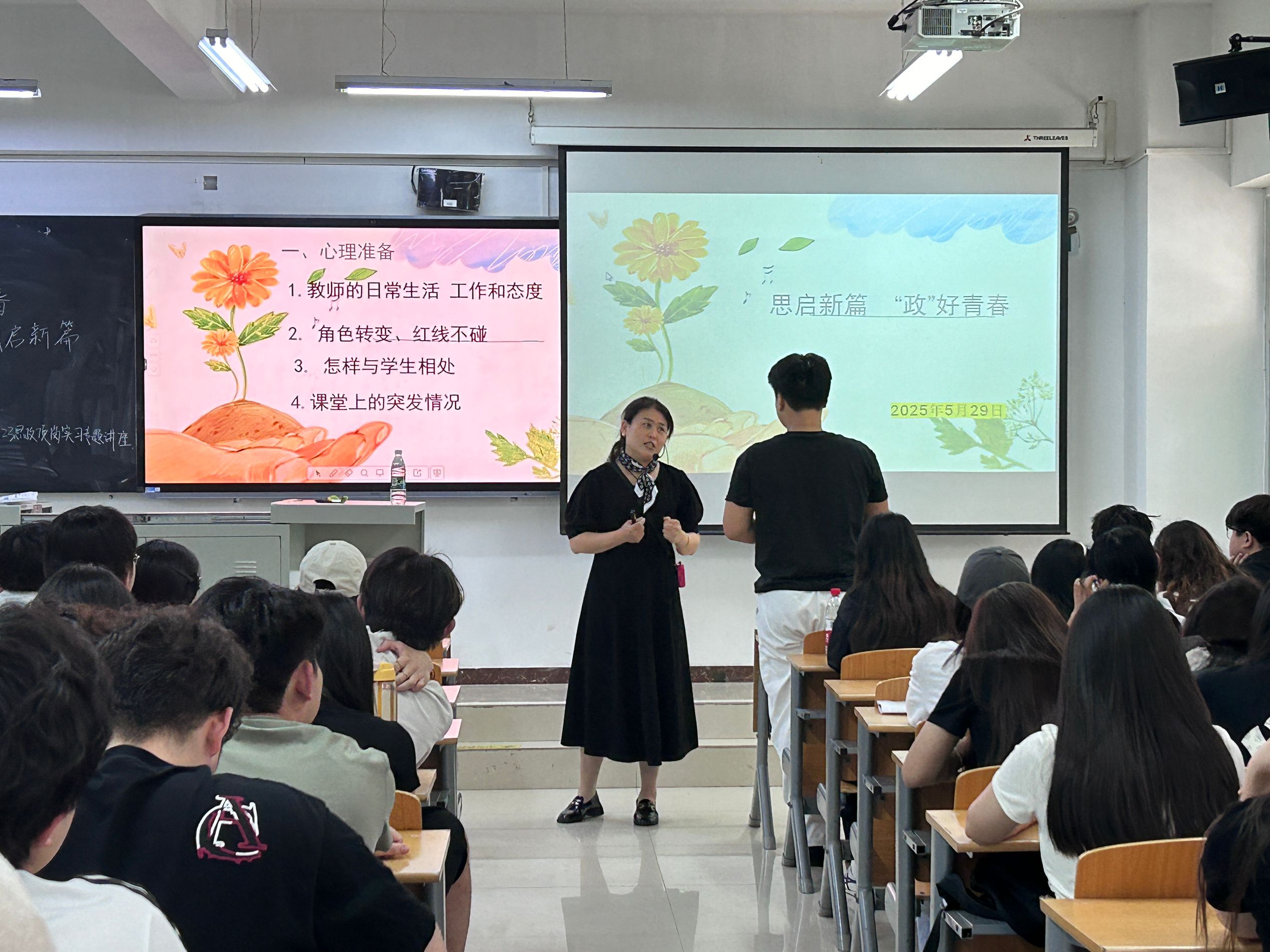 【基础教育名师讲堂】法政学部举办“政好青春 思启新篇”顶岗实习专题讲座-缩小 放大+ 2025-06-03为提升思想政治教育专业学生教育教学能力,助力其高质量完成顶岗实习工作,法政学部于5月29日在6教305教室举办“政好青春 思启新篇”顶岗实习专题讲座。beat365英国官方网站附属实验中学政治教研组组长、中学高级教师刘金凤应邀担任主讲嘉宾,为2023级思想政治教育专业全体学生带来兼具理论高度与实践深度的专业指导。 讲座聚焦“课堂教学组织策略”与“思政课备课方法论”两大核心议题展开。在课堂教学组织方面,刘老师紧密围绕习近平总书记“广大教师要做学生锤炼品格、学习知识、创新思维、奉献祖国的引路人”的重要指示精神,从心理准备、角色转变、物质准备三个维度进行深入剖析。在心理准备层面,她提醒同学们在实习期间要端正态度,以高度的责任感和积极进取的精神迎接各项挑战,强化职业认同感与使命感;在角色转变方面,着重强调要牢记习近平总书记对教师“为党育人、为国育才”的初心使命要求,坚守师德底线,不触碰师德红线,以高尚的师德风范引领学生成长,用心关爱每一位学生,以真诚的爱心和强烈的责任感建立良好的师生关系,为教育教学工作的顺利开展奠定坚实基础;在物质准备环节,明确指出《课程标准》是教学的纲领性文件,全套教材是落实立德树人根本任务的重要载体,建议同学们提前熟悉并深入钻研,为教学实践筑牢根基。 针对“如何准备一堂思政课”,刘老师从理论与实践两个维度进行了全面剖析。在理论层面,她紧扣习近平总书记在学校思想政治理论课教师座谈会上的重要讲话精神,深刻阐释了思政课作为关键课程的重要地位,强调教师要用心用情给学生心灵埋下真善美的种子,引导学生扣好人生第一粒扣子。在实践层面,她通过具体课例展示,生动呈现了优质思政课的设计思路与教学过程,为同学们提供了可借鉴、可操作的实践范例。 讲座期间,同学们全神贯注、认真记录,并积极参与互动交流,就实习与教学过程中可能遇到的问题踊跃提问。刘老师凭借丰富的经验和深厚的学识,耐心细致地解答了同学们的疑问,现场气氛热烈而融洽。