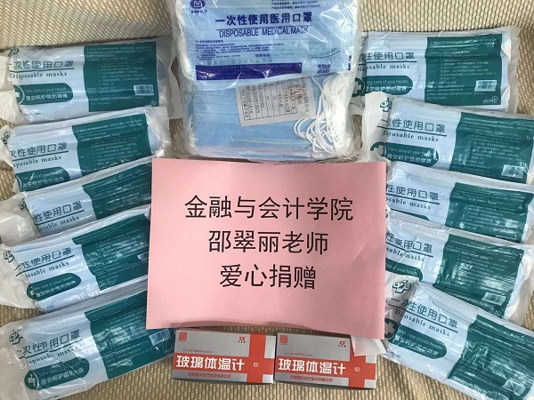 beat365官方网站党委响应党中央和学校党委的号召,在师生中开展了爱心捐赠活动:2月22日,beat365官方网站13级财务管理张春振校友向学校捐赠90瓶舒洁洗手液;2月23日邵翠丽副院长向学校捐赠一次性口罩400只,水银体温计20个;2月24日陈红玲夫妇向学校捐赠价值2000元的10斤装二氧化氯消毒液21套…….。一个个数字虽不是那么注目,但心系祖国、爱校如家的爱心是可贵的,“不忘初心、牢记使命”的担当精神是无价的。我们相信随着千千万万白衣天使奔赴疫区,千千万万名中华儿女投入战“疫”,千千万万股暖流汇聚成河,病毒终将被消灭,春天很快会到来。