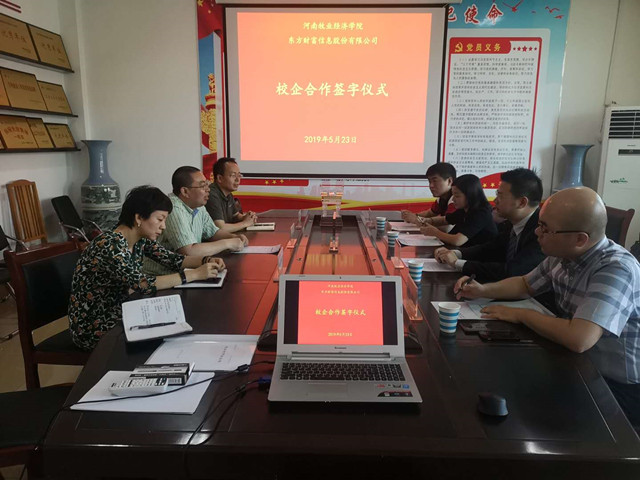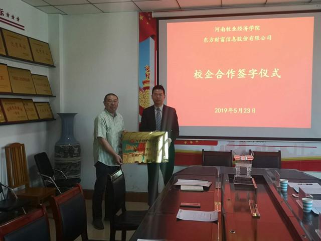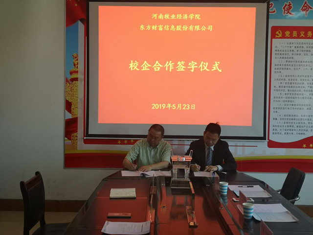 在双方代表的见证下,裴涛、黄良杰分别代表双方单位签署了东方财富信息股份有限公司—河南牧业经济学院的校企合作协议。