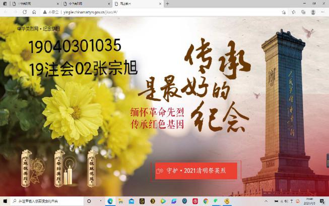 “不能忘记革命先烈,为了祖国,为了未来。用鲜血染红国旗,用生命唱响义勇军进行曲。让我们缅怀先烈,畅想未来。”——20注会01翟莹洁