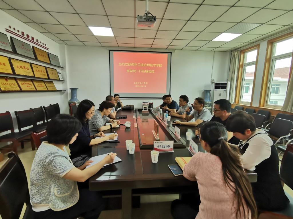 6月16日,郑州工业应用技术学院商学院院长孙鸣浦、副院长赵高送、副院长马克林等一行来beat365调研交流,beat365官方网站院长黄良杰、副院长王培玲和部分教师参加座谈会。