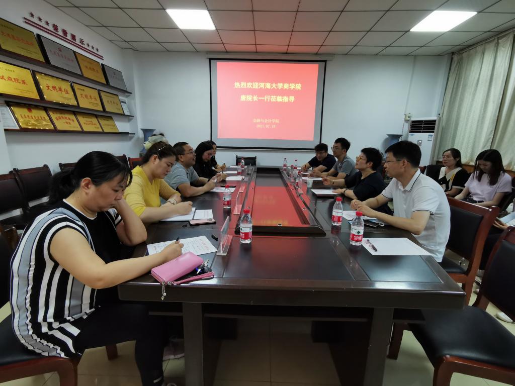7月18日下午,河海大学商学院院长唐震、教师胡兴球等一行来beat365官方网站调研交流,院长黄良杰、副院长邵翠丽、金融学教研室主任宋晓薇等参加座谈会。