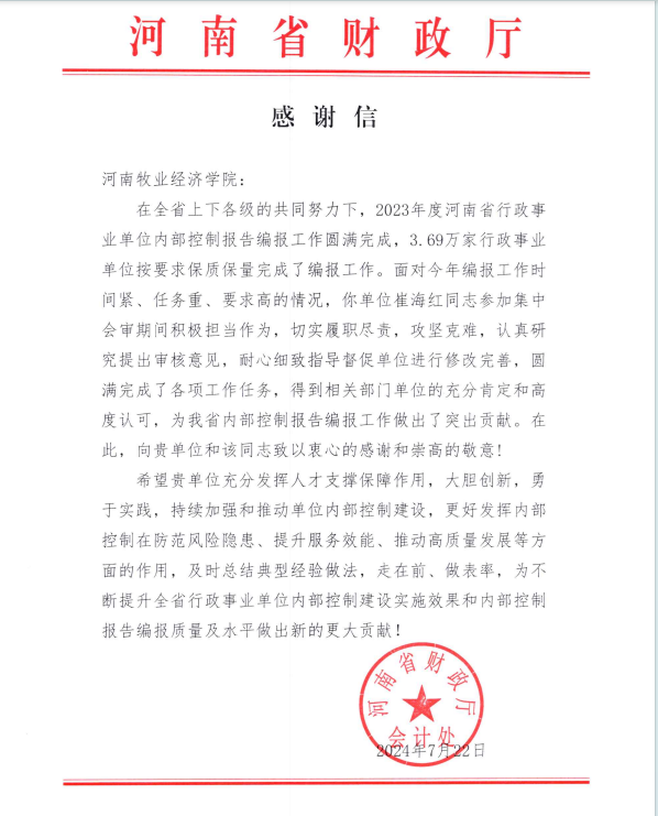 7月23日,beat365收到河南省财政厅会计处发来的感谢信,感谢副院长崔海红在2023年度河南省行政事业单位内部控制报告会审过程中,积极担当作为,切实履职尽责,攻坚克难,认真研究提出审核意见,耐心细致指导督促单位进行修改完善,圆满完成了各项工作任务。崔海红博士的专业水平和敬业精神得到相关部门单位的充分肯定和高度认可,为我省内部控制报告编报工作做出了突出贡献。河南省财政厅会计处向beat365和崔海红同志致以衷心的感谢和崇高的敬意!