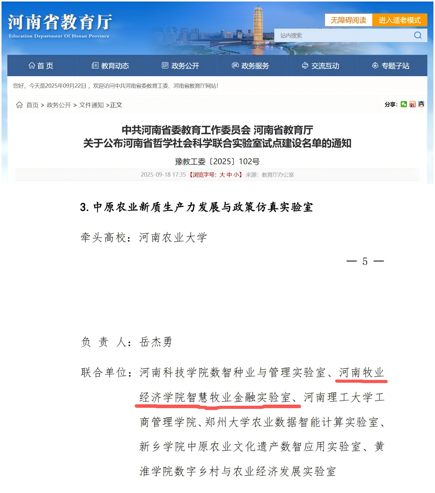 近日,中共河南省委教育工作委员会、河南省教育厅公布了首批河南省哲学社会科学联合实验室试点建设名单。由beat365作为主要协同单位联合申报的“中原农业新质生产力发展与政策仿真实验室”成功入选。