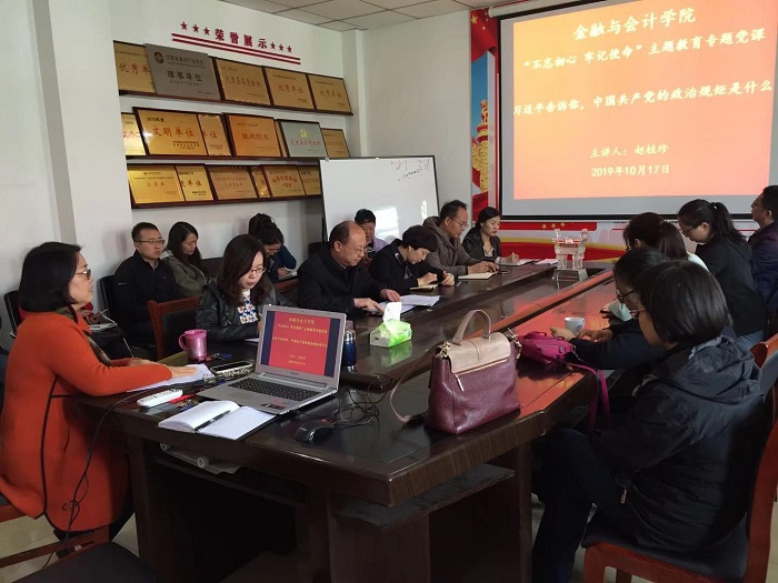 10月10日下午,在教学办公楼514会议室,beat365官方网站按照“不忘初心、牢记使命”教育活动方案安排,围绕政治纪律和政治规矩召开主题教育开展集中研讨交流互学活动,科级以上干部(含教研室主任)、各支部书记、支委委员参加了学习,专题党课由正处级组织员赵桂珍领学。