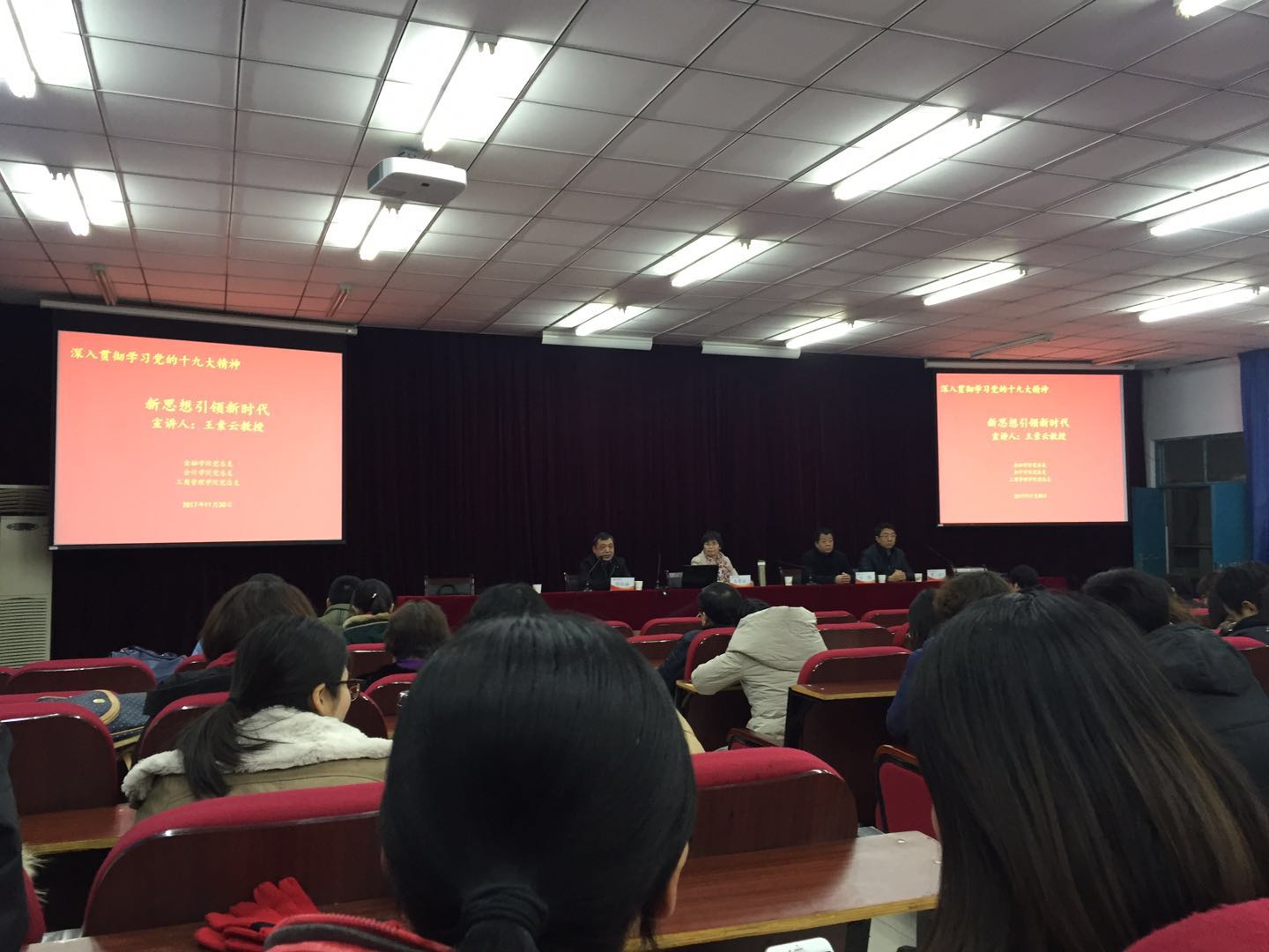 王素云教授以“新思想引领新时代”为主题,首先带领大家简要回顾了党的十九大盛况及取得的政治成果、理论成果、实践成果;随后从新时代的词源含义、新时代的基本依据、新时代的基本内涵、新时代的重大意义等方面站在理论高度对中国特色社会主义进入新时代这一重大政治论断进行了详细解读;最后王教授阐述了新时代中国特色社会主义理论的丰富内涵、历史贡献和哲学基础。宣讲报告深入浅出、紧扣主题、内容丰富,既有理论高度,又有很强的指导意义,赢得了阵阵热烈掌声。