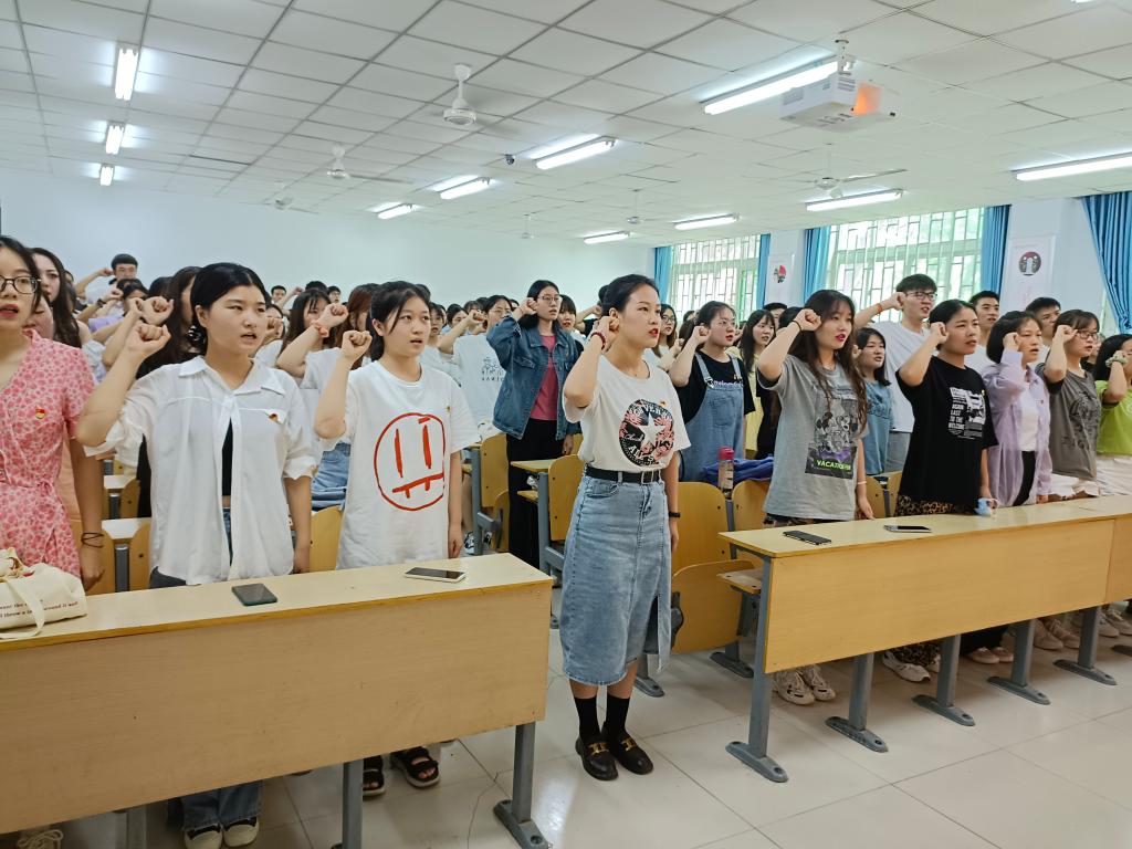 活动开始,通过观看《中国共产党百年述职报告》短片引入此次宣讲活动的主题,党史是最好的教科书和营养剂,汪书记围绕从百年党史中汲取思想的力量、自信的力量、精神的力量和奋斗的力量四个方面,带领大家一同回顾了从中国共产党的百年历史,系统学习领会百年党史蕴含的思想资源、实践智慧、精神力量和经验启示。汪书记提到,重温党的光辉历史对于我们深刻把握中国共产党砥砺奋进的光辉历程、奋力实现中华民族伟大复兴中国梦具有极为重大的现实意义。然后,汪书记对本次学习进行了总结概括,并对党员们寄予厚望,指出生逢于这个伟大新时代,更需要从百年党史中汲取前行的力量,希望党员们都能不忘初心再出发,牢记使命加油干,共同推进“中国号巨轮”在新的伟大征程中续写新的辉煌篇章。活动最后,全体学生正式党员重温入党誓词,接着,正式党员梁婷婷带领全体新发展的预备党员进行入党宣誓,通过宣誓仪式进一步增强了党员意识,坚定了对社会主义、共产主义的信念。