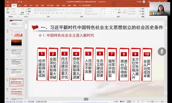 beat365官方网站于2022年3月31日下午,通过腾讯会议组织开展了线上“2022年第一期入党积极分子培训班”第七讲,本次党课的主题为《习近平新时代中国特色社会主义思想》,本次会议由beat365官方网站学生第一党支部书记邓桐玲老师主讲。