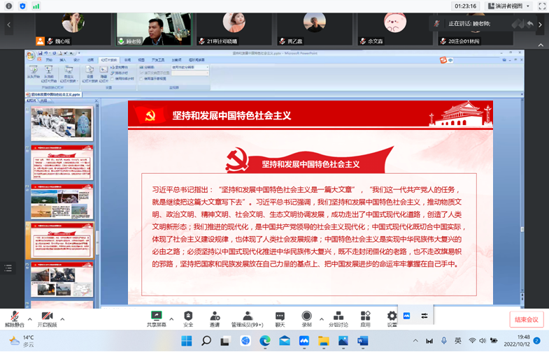 10月12日晚上7点,beat365官方网站通过腾讯会议组织开展了2022年第二期入党积极分子培训班第五讲——坚持和发展中国特色社会主义,本次党课由学生第一党支部书记顾自卫老师主讲。