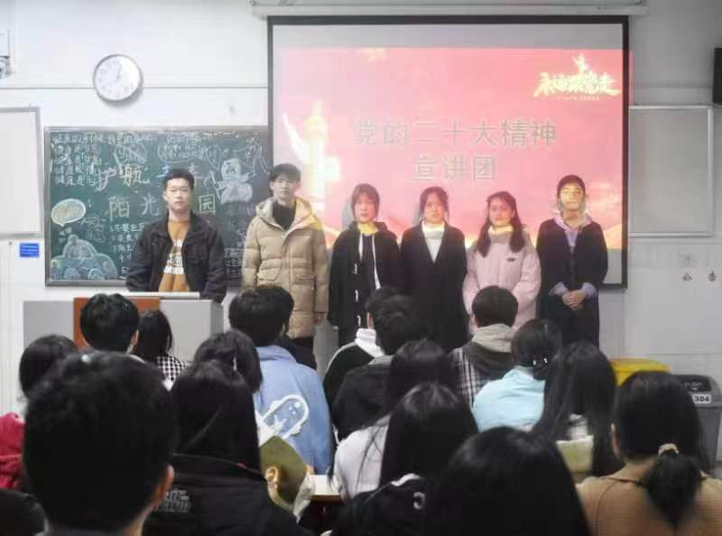 在宣讲活动中,主讲人带领同学们学习了习近平总书记在党的二十届一中全会上的重要讲话精神,着重把握党的二十大精神要义,深刻领会党的二十大主题,通过具体的事例向大家展示了国家近十年的伟大变革,解读了新时代新征程党的使命任务、中国式现代化的中国特色和本质要求。宣讲团的成员们通过讲述自己学习成长经历中的真实事例、切身体会及思想感悟,将党的二十大精神化作同学们的身边理、身边事。