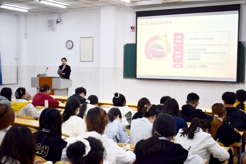张珂瑜老师主要从入党程序和注意事项两方面进行讲述,第一部分,张老师详细讲述了申请入党的条件、入党积极分子的确定和培养、发展对象的确定和考察、预备党员的接收、预备党员的教育考察和转正五大方面的内容,使大家对大学生入党的流程有了进一步的了解。第二部分,张珂瑜老师讲述了入党申请书、入党志愿书、思想汇报等内容的写作注意事项,使大家更加了解了入党相关材料的写作要求。最后,张珂瑜老师希望全体学员能够将入党程序了熟于心,遵守党规党纪,增强对中国共产党的热爱,端正入党动机;同时希望大家能够从递交入党申请书开始,便要对党忠诚,坚定不移跟党走,为党的事业贡献自己的青春力量。