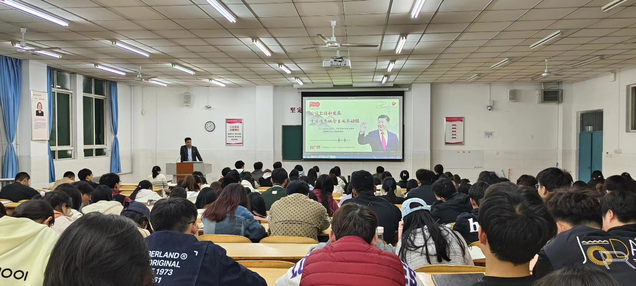 3月21日晚7点,beat365官方网站在W209教室举行2024年第一期入党积极分子培训班第三讲——《坚持和发展中国特色社会主义》,本次党课由学生第一党支部书记顾自卫主讲。