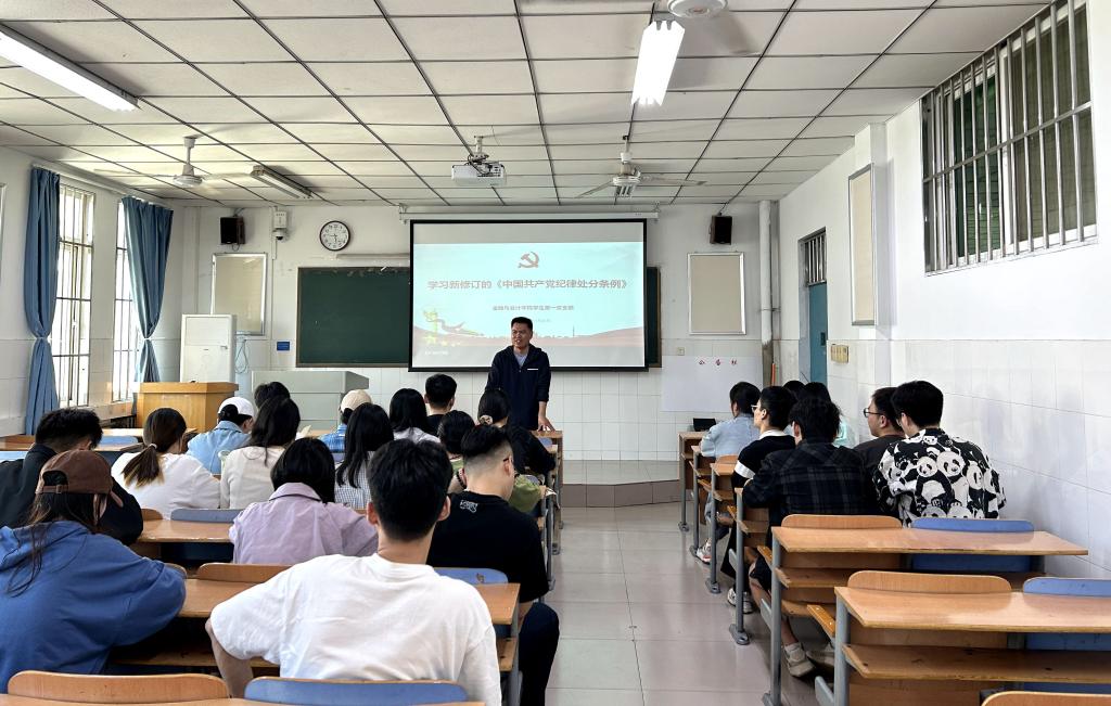 4月23日下午,beat365官方网站学生第一党支部在教学楼A502组织开展党纪学习教育主题党日活动,专题学习新修订的《中国共产党纪律处分条例》,支部全体党员参加。会议由党支部书记顾自卫主持。