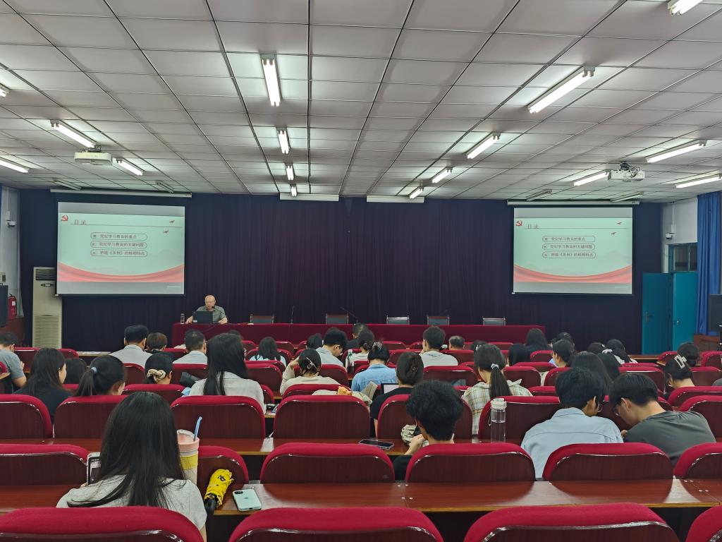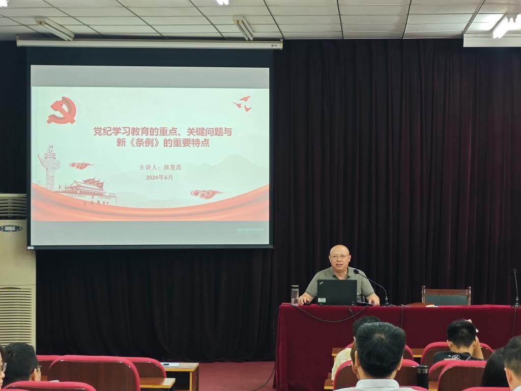 6月21日上午,beat365官方网站党委书记陈复昌以“党纪学习教育的重点、关键问题与《条例》的重要特点”为题,在英才校区综合实验楼E109会议室为学院师生党员讲授党纪学习教育专题党课。