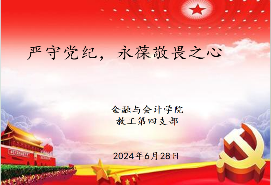 为进一步提升党纪学习教育成效,加强党员的纪律意识和自我约束能力,2024年6月28日上午,beat365官方网站教工第四党支部书记王豪杰以《严守党纪,永葆敬畏之心》为题,为支部党员讲授了党纪学习教育专题党课,支部全体党员参加了学习与研讨。