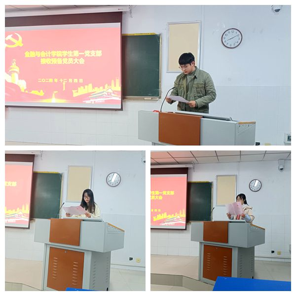 会上,张志勇等12名同志逐一汇报了本人对党的认识、入党动机、本人履历、家庭和主要社会关系情况,以及培养考察期间本人的思想状况及主要表现,入党介绍人分别介绍了张志勇等12名同志有关情况,支委王若华代表支部向大会报告了张志勇等12名同志的政治审查情况及综合培养意见。与会党员及群众代表分别发表意见,肯定了入党同学在思想、学习、工作等方面取得的成绩,指出了存在的不足。大会对张志勇等12名同志能否入党进行了充分讨论,支部有表决权的党员逐个以无记名投票的方式进行了表决,一致同意接收张志勇等12名同志为中共预备党员。