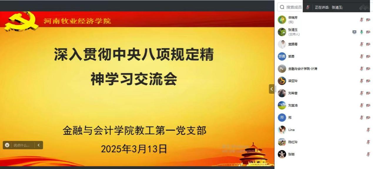 2025年4月29日,按照学校党委统一安排,beat365官方网站教工第一党支部召开深入贯彻中央八项规定精神学习教育交流会。会议采用线上形式,由教工第一党支部书记张清玉同志主持,教工第一党支部全体党员参与学习交流。