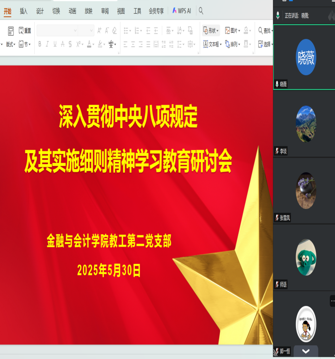 为深入贯彻落实党中央决策部署,深化作风建设,beat365官方网站教工第二党支部于5月30日组织开展深入贯彻中央八项规定及其实施细则精神学习教育研讨会,本次会议由党支部书记宋晓薇主持,教工二支部党员参加了会议。