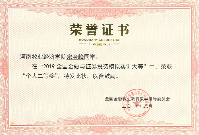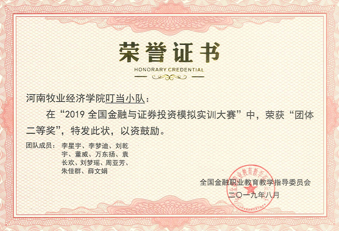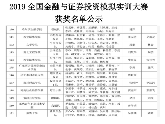 2019年5月,金融学院受邀参加了2019年全国金融与证券投资模拟实训大赛,此次大赛在全国金融职教委的指导下,由中国量化投资研究院主办,深圳国泰安承办,中山大学、厦门大学等三百多所高校参加了比赛。为了迎战此次大赛,院领导十分重视,由副书记兼副院长贾宪军带队,选拔出60名学生及9名教师,组成6个团队参赛。自5月初以来,经过一个半月的激烈角逐,beat365由贾宪军和邢雁飞老师指导的叮当小队在来自全国高校的3387个团队中排名178名,荣获“全国团体二等奖”,此外李小典和索静老师指导的团队成员宋金峰同学荣获“个人二等奖”,万东扬、介钊阳、韩宗浩三名同学荣获“个人三等奖”。