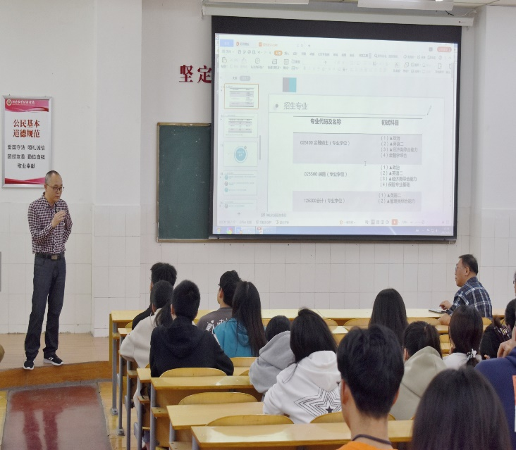 讲座伊始,广东金融学院院长孙进军从学校简介、招生专业、招生政策三方面向同学们进行介绍。孙院长介绍到广东金融学院是一所致力于将学校建设成为国内一流的应用型金融品牌大学。在研究生的培养方面,广东金融学院具有雄厚的师资力量及科学研究成果,可以为研究生提供优异的实践基地,并列举了学院研究生毕业后的就业情况,让beat365学子对广东金融学院有了更深入的了解。在招生政策方面,他对招生专业、调剂政策、学费和收费标准方面做了详细介绍,包括学院的奖助学金政策,帮助同学们更好的规划考研之路。
