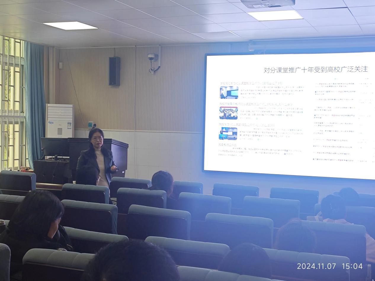 讲座中,王永芬教授从对分课堂之道、对分课堂之术及对分课堂之行三个层次对对分课堂是什么?为什么要用?怎么用?进行了详细的阐释和示范。在对分课堂之道中,王教授指出高校教学现状对高等教育发展提出了新的要求,结合新要求,我们课堂中要注重学生独学的环节,要保证学生的思考权、话语权,尊重学生的课堂掌控权,突出对分课堂“亮”“考”“帮”的特点。在对分课堂之术方面,王教授对对分课堂的四元教学,即精讲留白、独学内化、小组讨论、师生交流四个方面以当堂对分和隔堂对分两种形式分别进行了详细的阐述。在对分课堂之行方面,王教授用自己上课的实例,对大家关心的实践操作进行了详细的示范,她强调,教师在实际教学中,要根据不同课程特点灵活运用对分课堂,及时调整教学策略,关注学生的反馈,不断优化教学过程,真正让对分课堂在大学教学中发挥出巨大的作用。