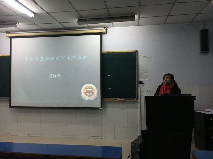 本学期金融学院继续开展院内教师系列讲座活动,为充分调动学生对专业知识学习的积极性,加强学生对金融市场相关知识的了解与典当行业的认知,于12月14日下午,在教学楼E102为beat36515、17级典当班学生开展“走向普惠金融的河南典当业”的专题讲座,主讲人为beat365陈红玲副教授。书记胡红林、贾宪军及部分教师出席并认真听取了本次讲座。本次讲座由贾宪军书记主持。