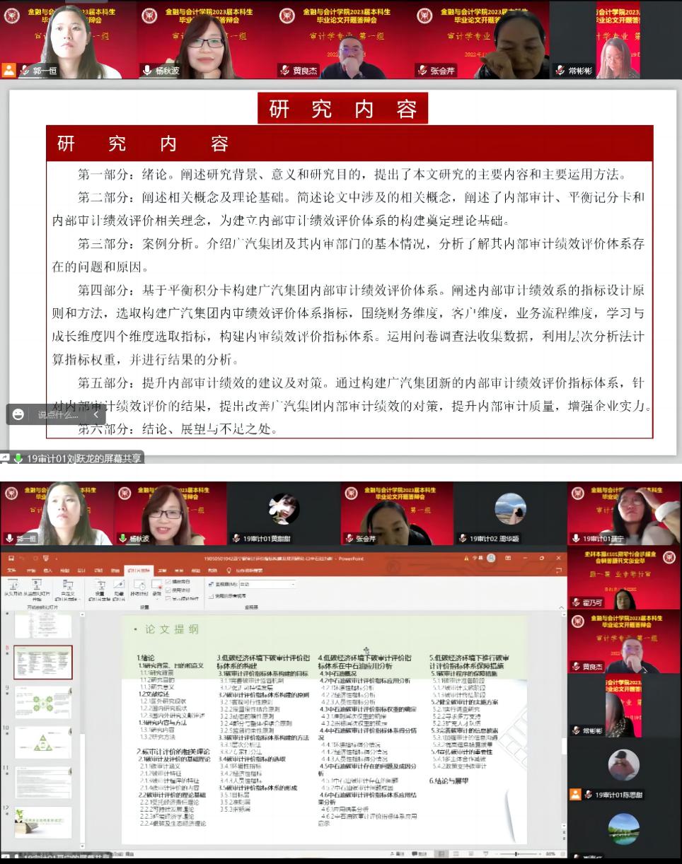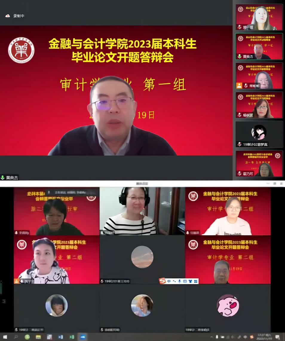 根据《河南牧业经济学院本科毕业论文(设计)工作条例》和《beat365官方网站2023届本科毕业论文工作实施方案》的要求,beat365官方网站2023届审计学专业本科毕业论文开题答辩于2022年11月19日8:00在英才校区举行,由于疫情的原因,答辩采取线上的形式举行,共分2个答辩小组,审计学专业118名同学参加了开题答辩。