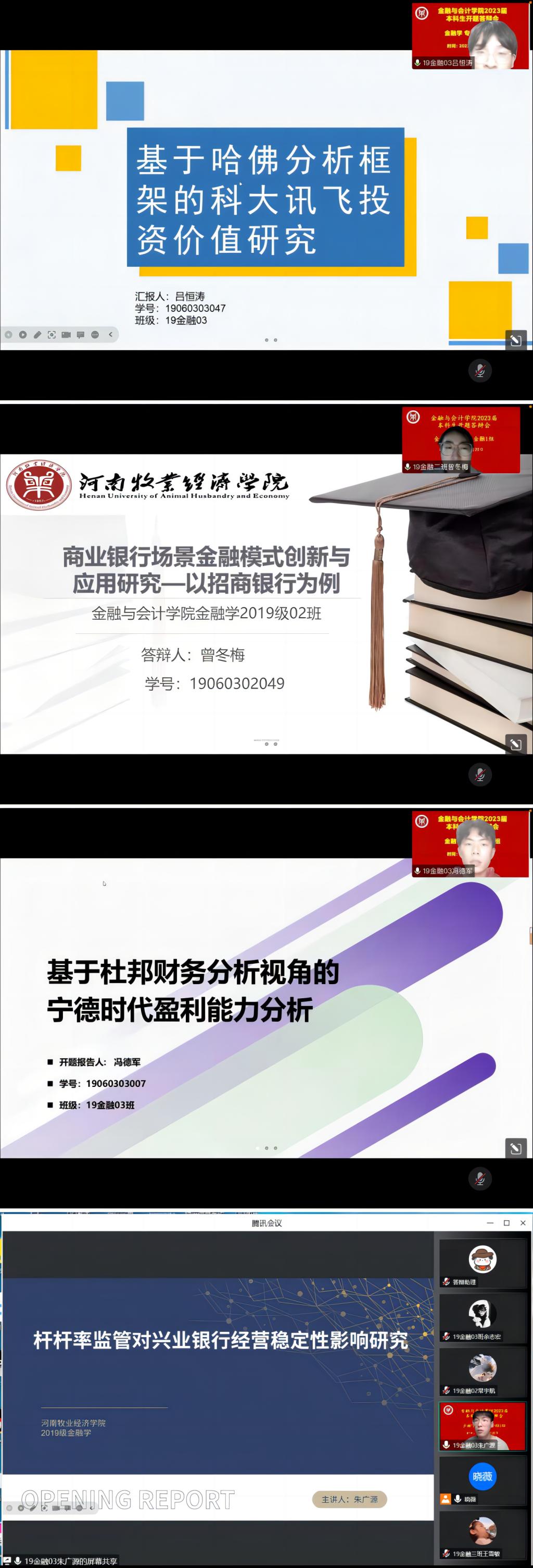 根据《河南牧业经济学院本科毕业论文(设计)工作条例》和《beat365官方网站2023届本科毕业论文工作实施方案》的要求,beat3652023届金融学本科专业毕业论文开题答辩于2022年11月19日、20日两天举行,本次答辩采用线上方式举行,共分为两个答辩小组,共有163名学生和19名指导老师参加开题报告答辩会。