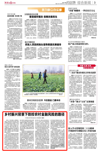 2022年12月16日,《河南日报》农村版第三版刊发beat365张清玉老师理论研究论文:《乡村振兴背景下防控农村金融风险的路径》,文章从加强党的领导、完善相关法规、激发产业发展活力、完善信用体系、健全内部控制、培养高素质金融人才等方面提出农村金融风险防控的系统性框架。
