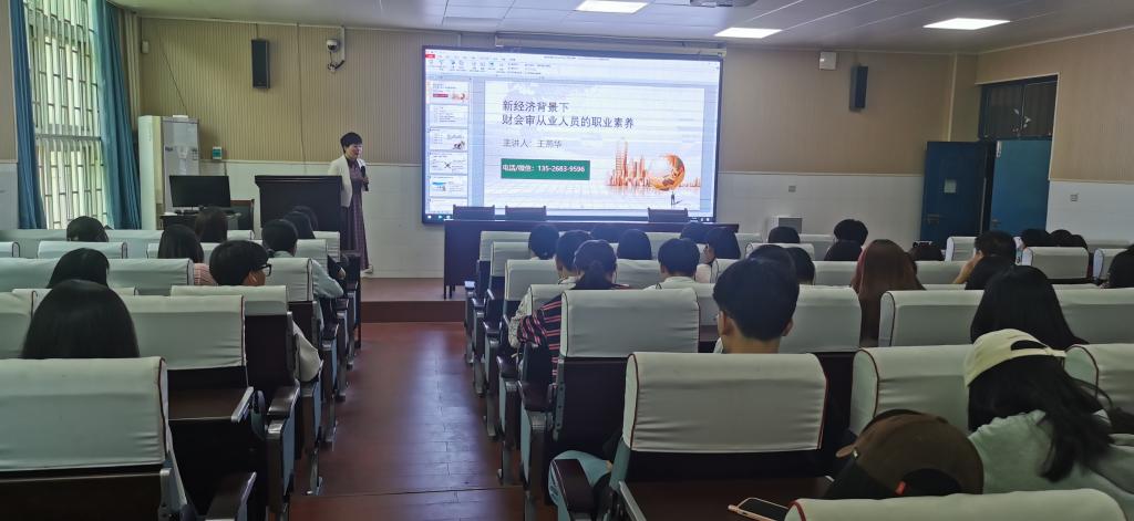 讲座开始前,beat365官方网站院长黄良杰教授为王延华总经理颁发了“校外实习指导老师”聘书。王延华总经理从新经济的内涵,新经济下的“放管服”经济改革,“十四五”时期会计改革与发展方向,财会专业大学生就业形势,新经济背景下财会从业人员的职业素养等几方面进行展开讲解。她讲道,“新技术”、“新模式”、“新制度”、“新文化”相互 影响、协同演化,构成了当代语境下我国新经济时代的主要内涵。“放管服”经济改革的的发展趋势,环境日趋完善,服务人性化、高效化,管理精准化、科学化、法治化。她结合多年丰富的实践经验,分析行业发展变革中面临的机遇和挑战,特别指出在工作中需要坚守道德底线,提升专业水准。鼓励同学们要确定职业生涯目标,树立终身学习的观念,提升综合素质,考取相关证书,以提高就业机会。