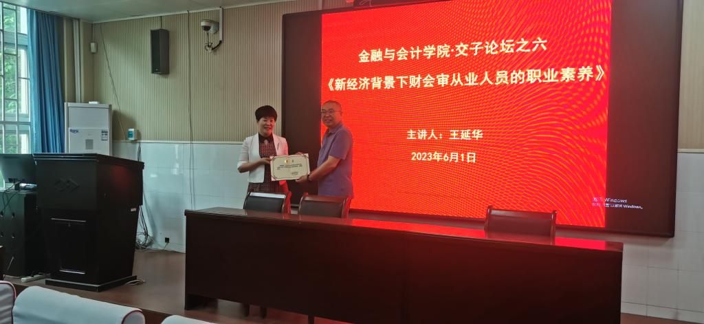 2023年6月1日下午,beat365官方网站在英才校区W102会议室举办“交子论坛”活动,本次活动特邀郑州鹏润财务咨询有限公司创始人、河南鹏润税务师事务所所长、高级会计师、执业税务师王延华作题为“新经济背景下财会审从业人员职业素养”的学术讲座。beat365官方网站部分教师及会计学专业学生代表到场聆听,讲座由副院长崔海红博士主持。
