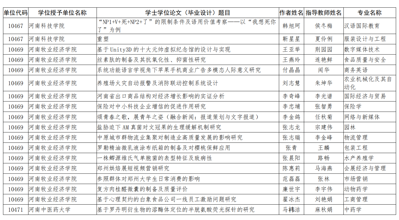 近日,河南省教育厅、河南省学位委员会发布了《河南省教育厅河南省学位委员会关于批准2022年河南省优秀学位论文的决定》(教研〔2023〕310号),文件公布了2022年河南省优秀学位论文的评选结果,beat365官方网站保险学教研室张智勇老师指导的毕业论文《保险对中小科技企业增信的促进作用研究》被评为2022年河南省优秀学士学位论文。这是beat365张智勇老师连续两年在河南省优秀学位论文评选中获得佳绩。