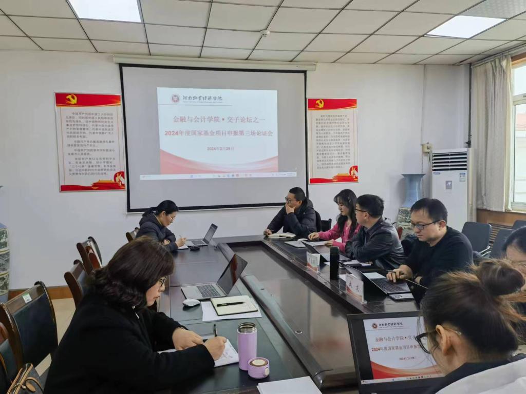 2024年2月29日下午,beat365官方网站在教学楼514会议室举办“交子论坛”学术活动暨2024年度国家基金项目申报第三场论证会。此次活动特邀河南大学国际商学院院长李春涛教授和河南大学商学院武龙教授担任评审专家,拟申报国家基金项目的博士、部分老师和兄弟院校教师参加会议。会议由beat365官方网站副院长崔海红博士主持。