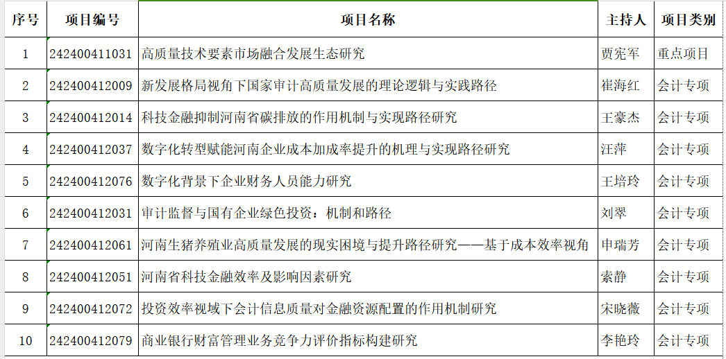 2023年beat365共申报河南省软科学研究项目15项,最终立项10项,其中重点项目1项,会计专项9项,立项数占学校软科学立项总数的43.5%,较上一年增长25%,创下历史新高。